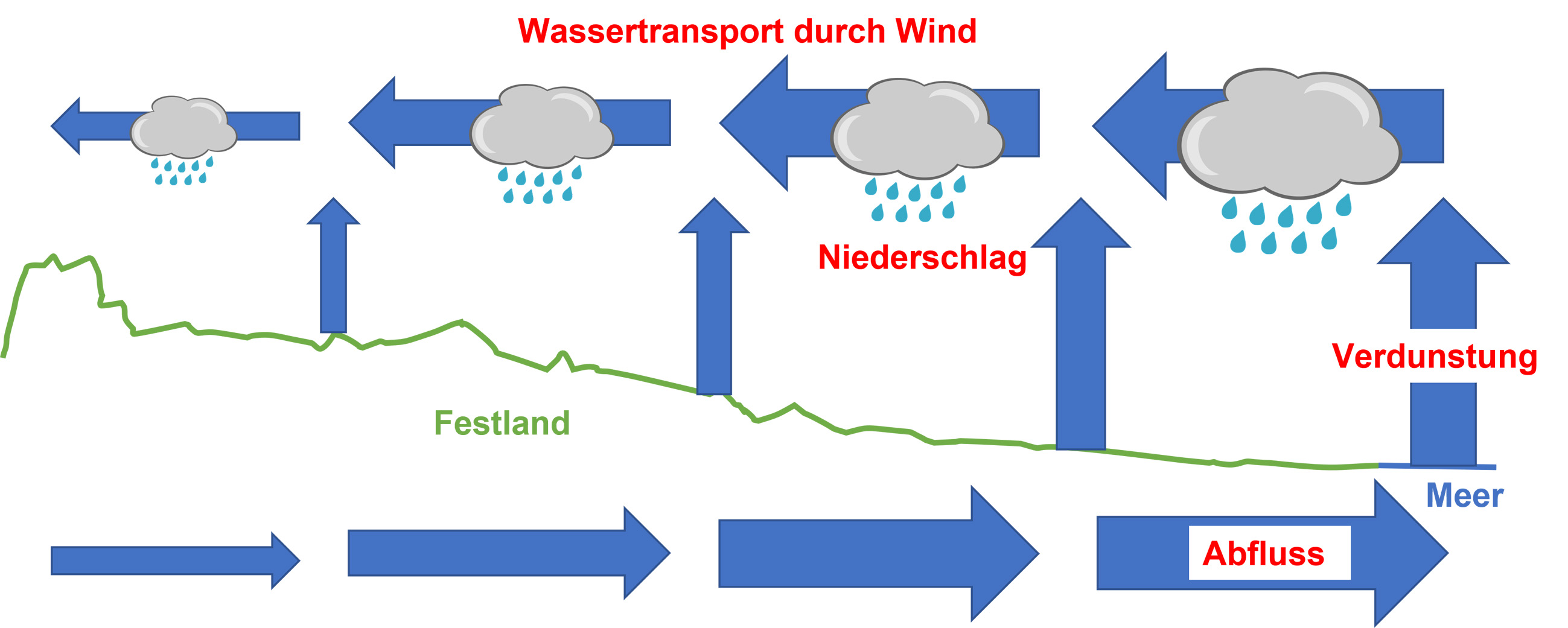 Ein großer Teil des Wassers, der als Regen über Land fällt, stammt ursprünglich aus den Ozeanen. Transportiert wird er in den atmosphärischen Luftschichten durch den Wind.